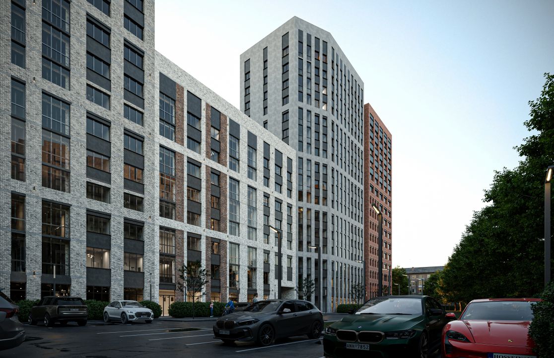 Архитектура проекта сочетает в себе модернизм и элементы ар-деко, что придает ему яркую индивидуальность. Секции разной этажности от 8 до 16 этажей создают комфортную и сомасштабную человеку городскую среду. Фасады отделаны клинкерной плиткой под кирпич, алюминиевыми композитными панелями и витражным остеклением.