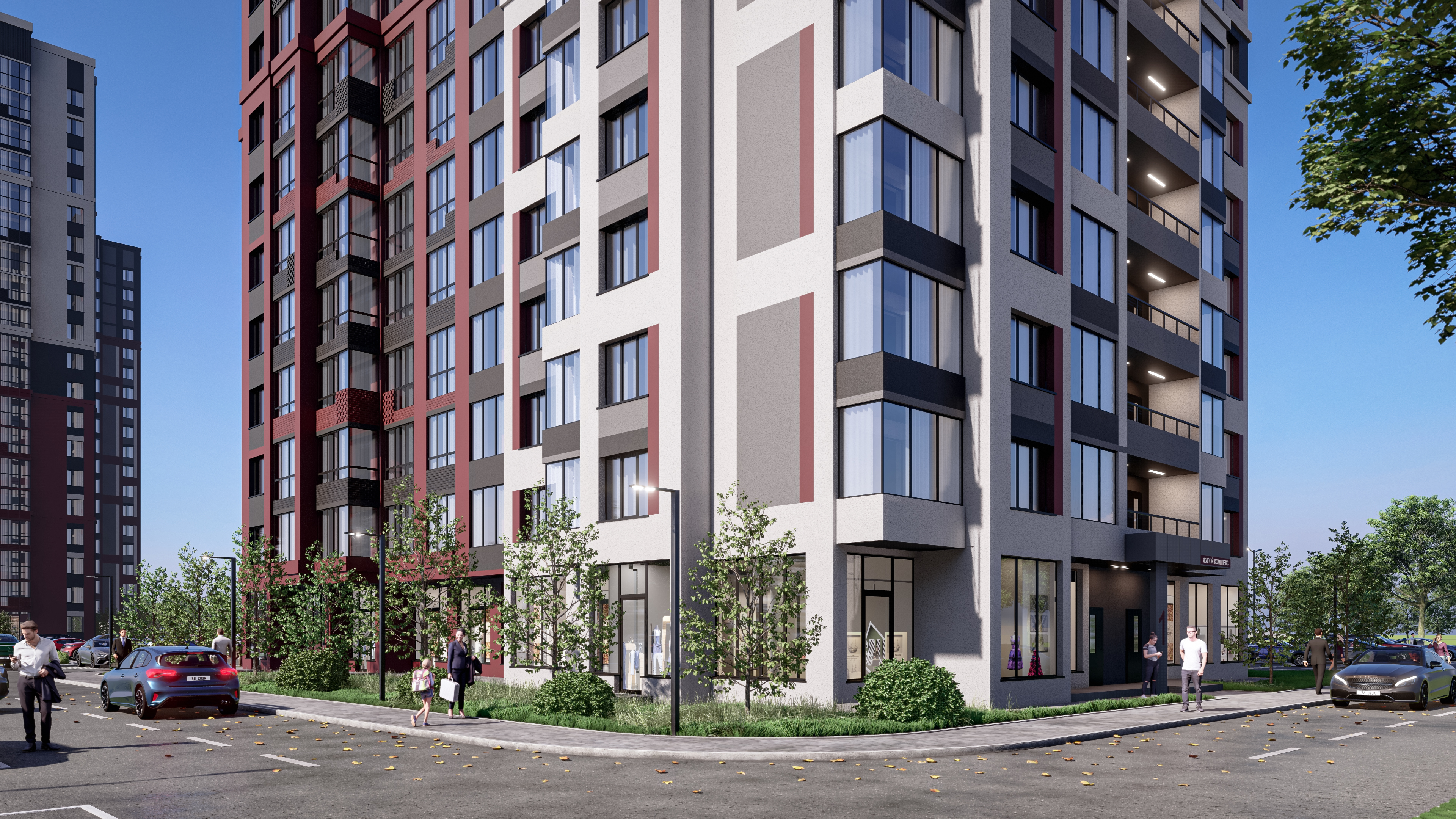 Первые два этажа предназначены под торговые и офисные коммерческие помещения. Там разместят магазины, аптеки, кафе. При желании жители могут приобрести помещение под сетевой бизнес. Для каждого коммерческого пространства обустроена входная группа, потолки и панорамные окна.