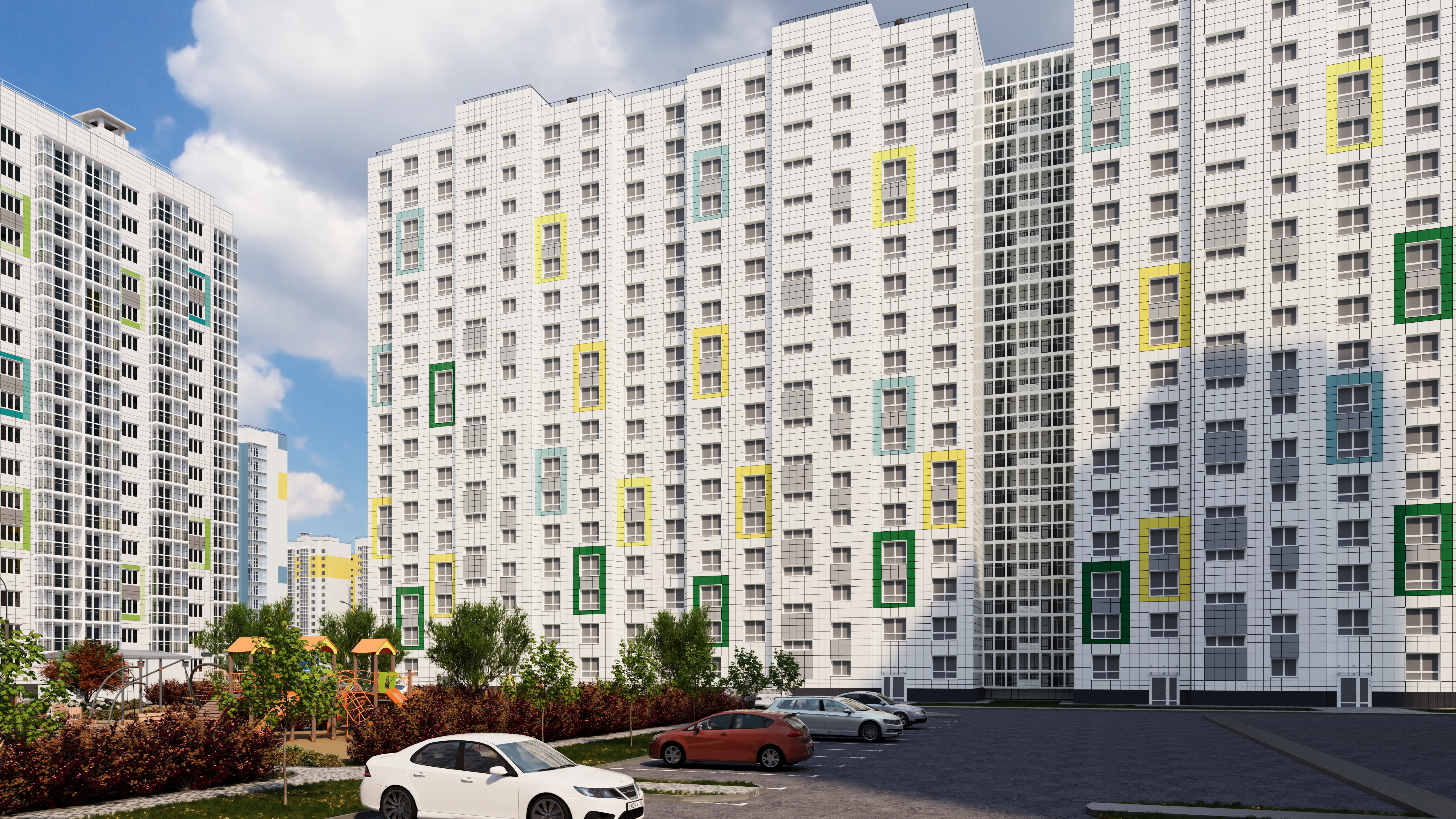 Стены жилищного комплекса выполнены из тепло- и звукоизоляционных материалов, а облицовка здания представлена вентилируемым фасадом.